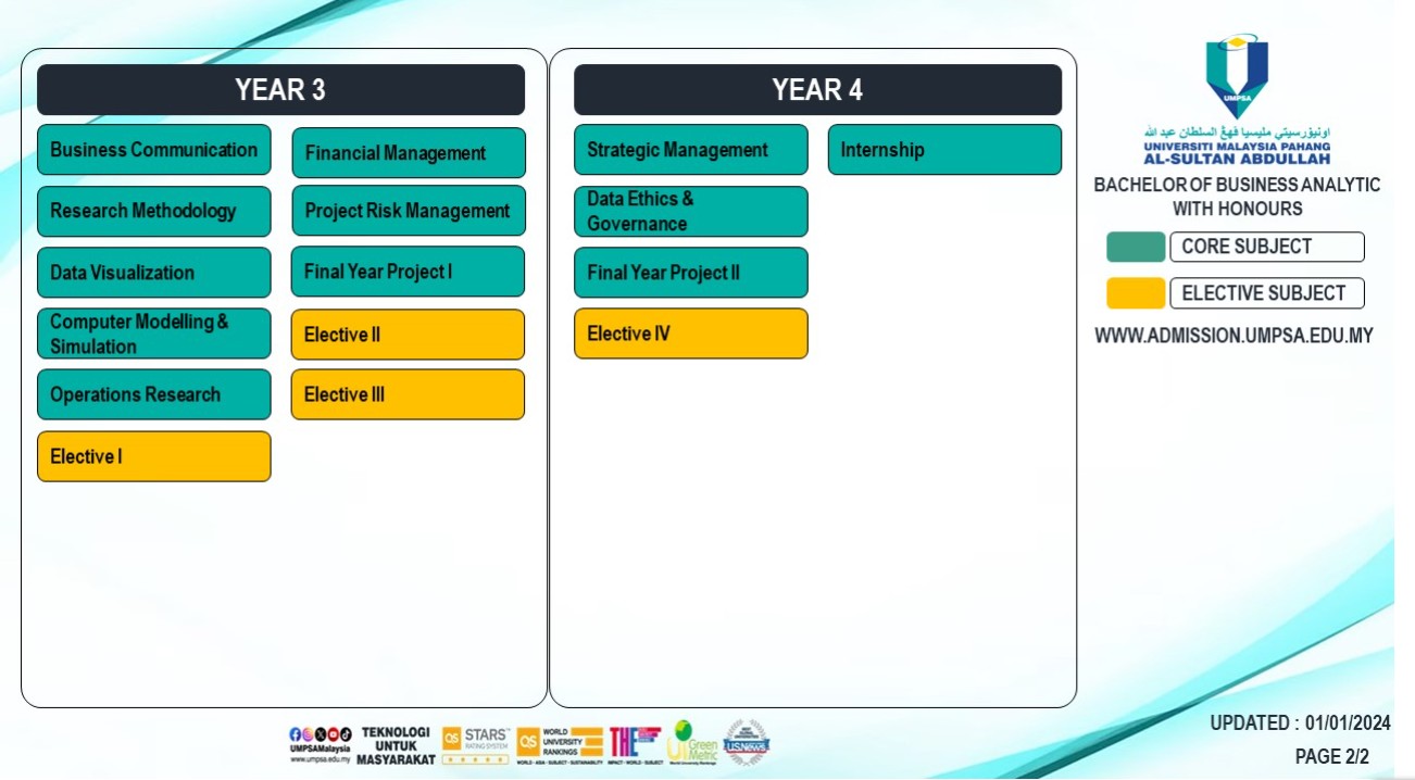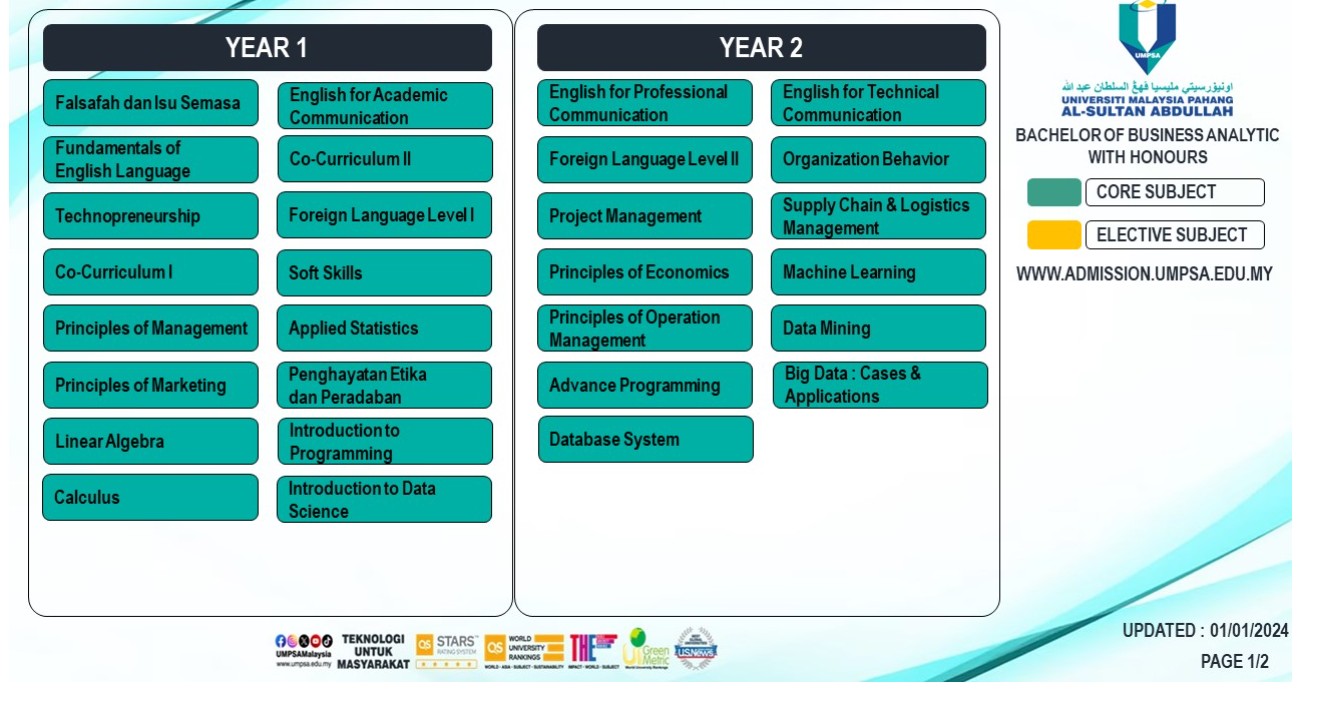 Business Engineering is a Dual Degree Program with ESB Business School, Reutlingen University (HsRT), Germany. It is one of the premium programs in UMP. Students enrolled in this program will complete their first and second year of study in UMP and those who fulfil academic requirements may continue their third and fourth year of study in Germany. The successor of dual degree will be awarded the Bachelor of Business Engineering with Honours by UMP and second degree by a University at German. Business Engineering program places a strong emphasis on the unique combination of Business and Engineering knowledge. It has been obtained accreditation by the Malaysian Qualifications Agency (MQA) and the professional body, The Chartered Institute of Logistics and Transport (CILT), United Kingdom (UK). In order for the students in this program to experience the German industry and culture, Professors from Germany will be part of the teaching team in UMP and German Language class will be available every day for students. This programme assimilates the knowledge of Business and Engineering allowing graduates to gain a competitive edge in technically oriented business positions. Therefore, the graduates will be leaders in business engineering through the integration of business engineering knowledge and skills in innovating business practices and expected to be the champion in the area of logistics, supply chain, and production. * The programme is not subject to Engineering Accreditation Council (EAC) accreditation.