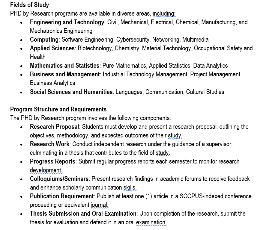 UMPSA offers PHD by Research programs across various faculties, enabling students to engage in independent research under expert supervision. These programs are designed to cultivate advanced research skills and contribute to scholarly knowledge in specific fields.